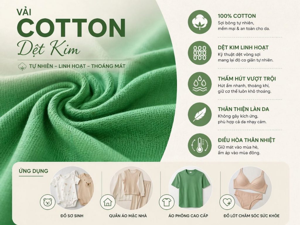 Vải cotton dệt kim vô cùng thân thiện, không gây kích ứng và có khả năng điều hòa thân nhiệt rất tốt cho làn da nhạy cảm. Sản phẩm này chiếm lĩnh thị trường các mặt hàng đồ sơ sinh, quần áo mặc nhà, áo phông cao cấp và đồ lót chăm sóc sức khỏe.